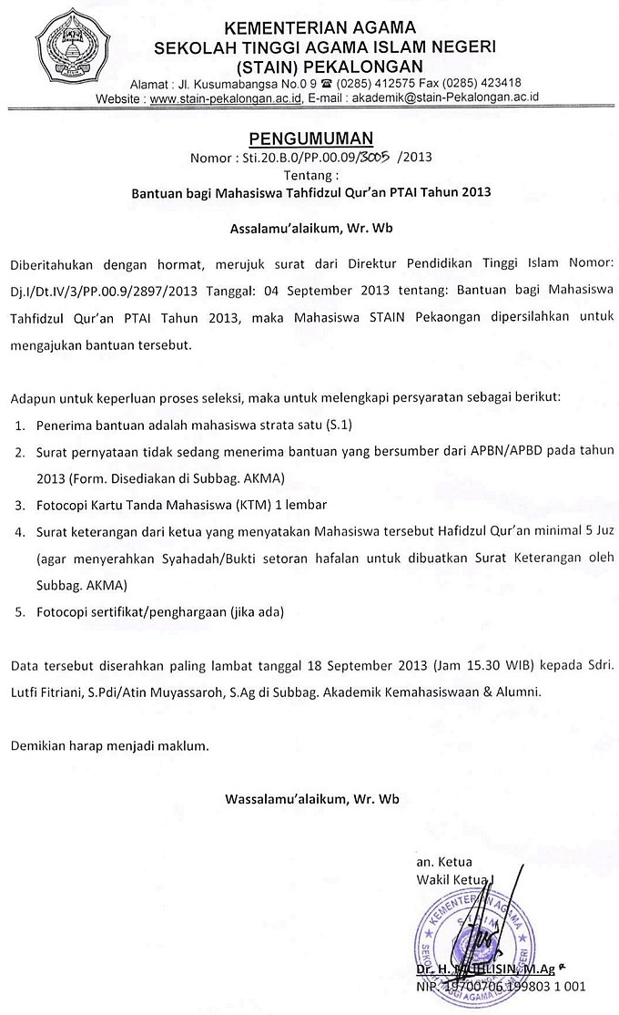 Bantuan Bagi Mahasiswa Tahfidzul Qur’an PTAI Tahun 2013